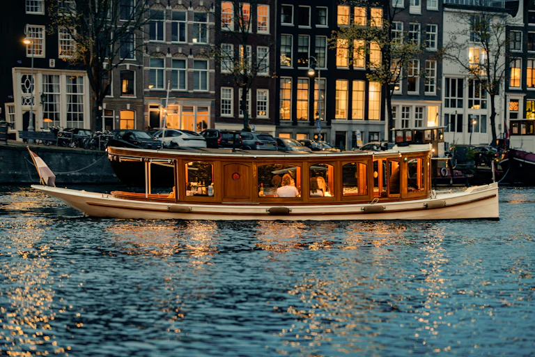 Step aboard our warm, luxury saloon boats and experience Amsterdam in an intimate, unforgettable way during our enchanting 90-minute Light Art tour. Sit back and indulge in unlimited drinks and a beautifully arranged platter with refined Dutch bites, all while the city glows magically around you — the perfect moment to relax, connect, and create a memory you’ll want to relive.