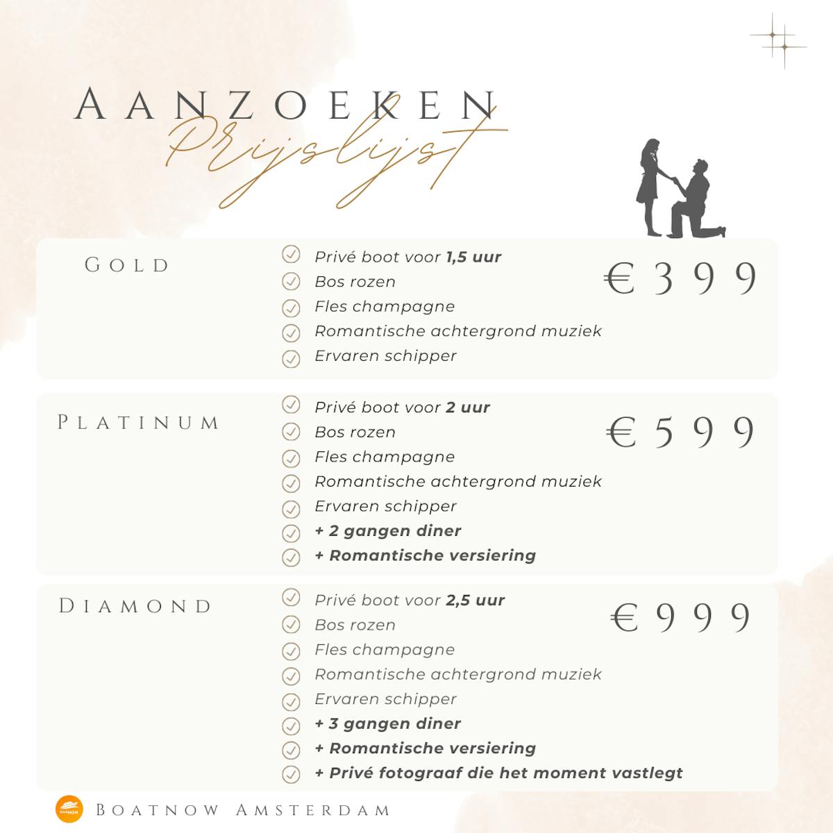 Imagina invitar a tu pareja a un paseo romántico por Ámsterdam en un pequeño barco salón como el Sarah. El barco pasa bajo el icónico Magere Brug (Puente Delgado), y ahí haces tu propuesta. El capitán se encarga de tener el champán y los aperitivos listos. Un momento para recordar toda la vida.